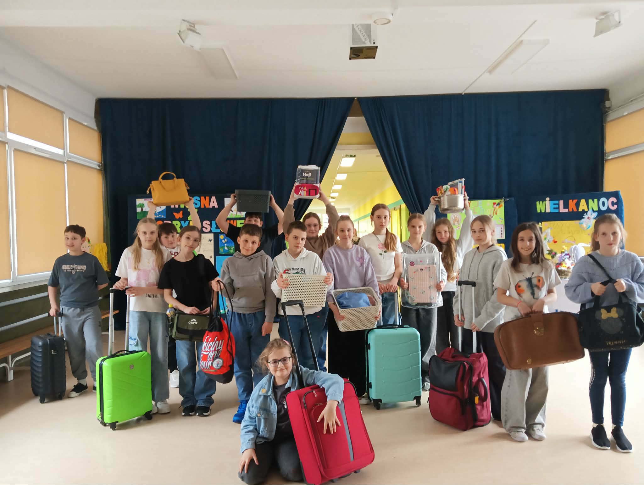 Tego dnia nasi uczniowie zamienili plecaki na inną formę pojemników, w których przynosili swoje książki, zeszyty i szkolne akcesoria. Pojawiły się kosze, walizki, wózki, kartony, futerały na instrumenty, poszewki, zabawki dla dzieci. Kreatywność i fantazja uczniów nie miała żadnych granic.