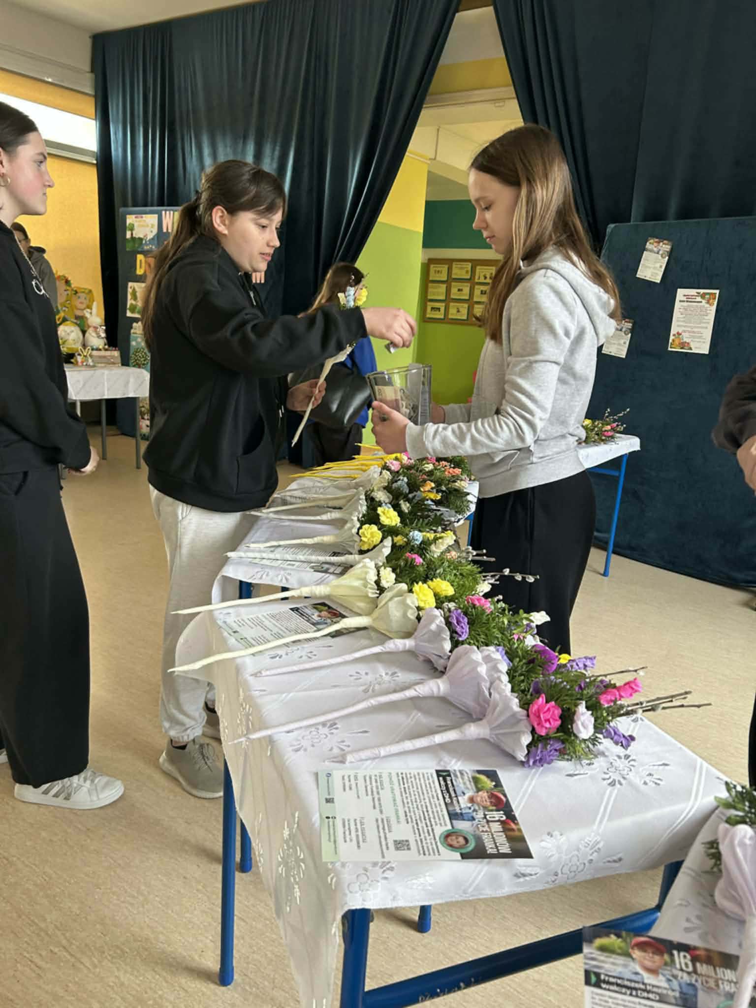 Dziękujemy: Izabelli Adamus, Wiktorii Stasio, Roksanie Ambrozińskiej, Paulinie Sadowskiej, Jagodzie Wojdal z klasy VII b, Kindze Szulc, Weronice Woźniak i Hubertowi Wożniak z klasy VII a za przygotowanie i przeprowadzenie kiermaszu wielkanocnego.